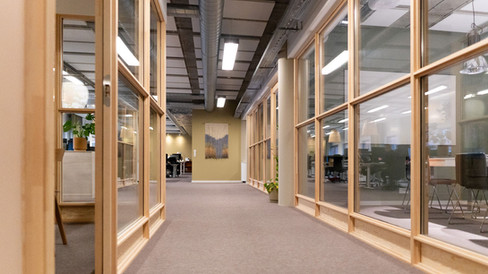 Vi anvender bl.a. glasvægge fra DEKO – en elegant og fleksibel løsning, der sikrer masser af dagslys og et moderne, transparent udtryk.